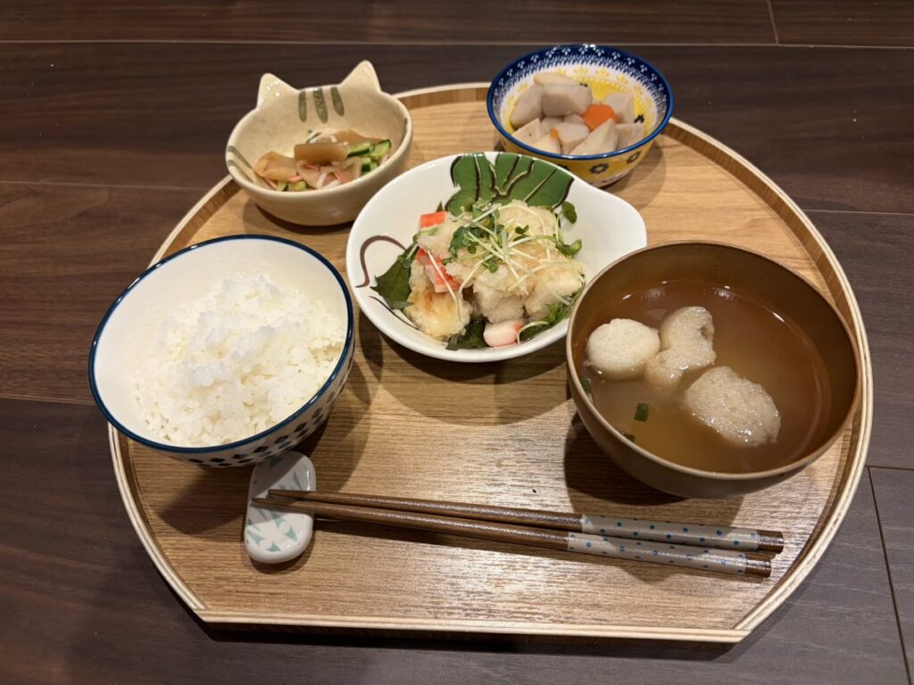 里芋煮はやさしい味付けでほっとする美味しさ、干瓢はふんわり柔らかく噛みやすくて、どなたでも食べやすい仕上がりでした。主菜の鶏胸肉のポン酢チキンはさっぱりしつつ旨みがしっかり感じられ、ごはんが進みます。今日も「毎日ここで食べたい」と思える、丁寧で温かいお食事でした。